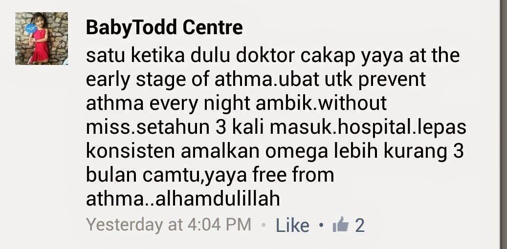 Walaupun saya tahu, penyakit asma tidak boleh diubati, tetapi sekurang-kurangnya suami saya semakin sihat dan asmanya datang sekali sekali dan tidak teruk seperti dahulu. Syukur Alhamdulillah. Penghidap asma sejak 15 tahun yang lepas telah mendapat kesihatan yang lebih baik sekarang.