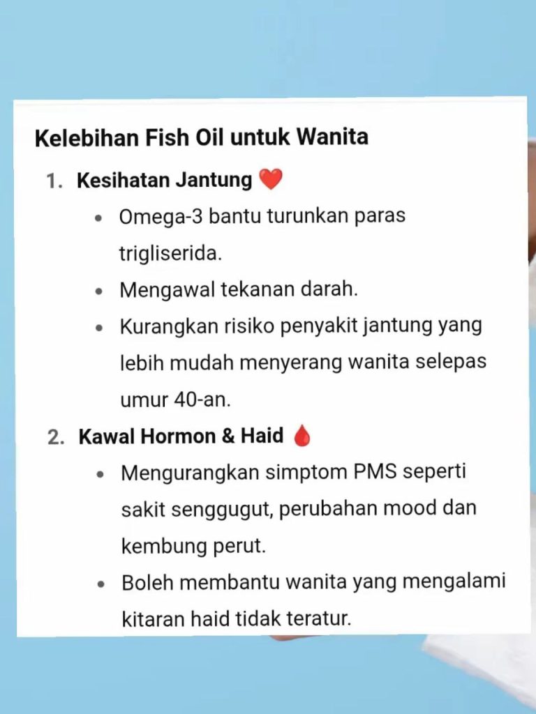 Fish oil adalah supplement serba guna untuk wanita. Dari menjaga jantung, menstabilkan hormon, menyokong kesihatan mental, mencantikkan kulit, hingga menguatkan sendi dan mata – semuanya ada dalam kapsul kecil ini. Bagi wanita hamil atau menyusu, manfaatnya lebih besar kerana ia memberi kesan terus kepada bayi juga.