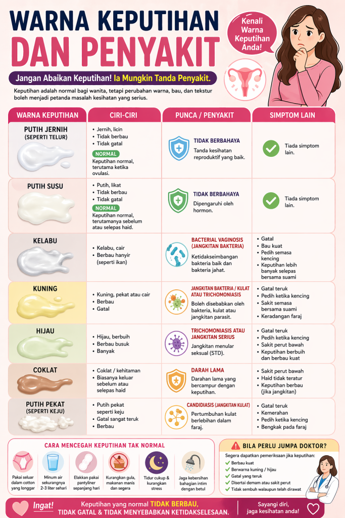 Keputihan adalah perkara biasa bagi wanita. Namun, keputihan yang terlalu banyak, berbau atau berubah warna boleh menjadi tanda masalah kesihatan yang lebih serius. Keputihan Tanda Penyakit?Ramai wanita menganggap keputihan sebagai perkara normal, sedangkan dalam sesetengah keadaan, ia boleh menjadi petanda penyakit senyap yang perlu diberi perhatian.