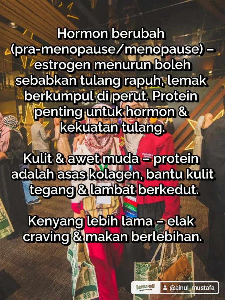 👉 Hakikatnya, keperluan protein wanita meningkat apabila usia meningkat, terutamanya untuk melawan kehilangan otot (sarcopenia), ketidakseimbangan hormon dan penurunan metabolisme.