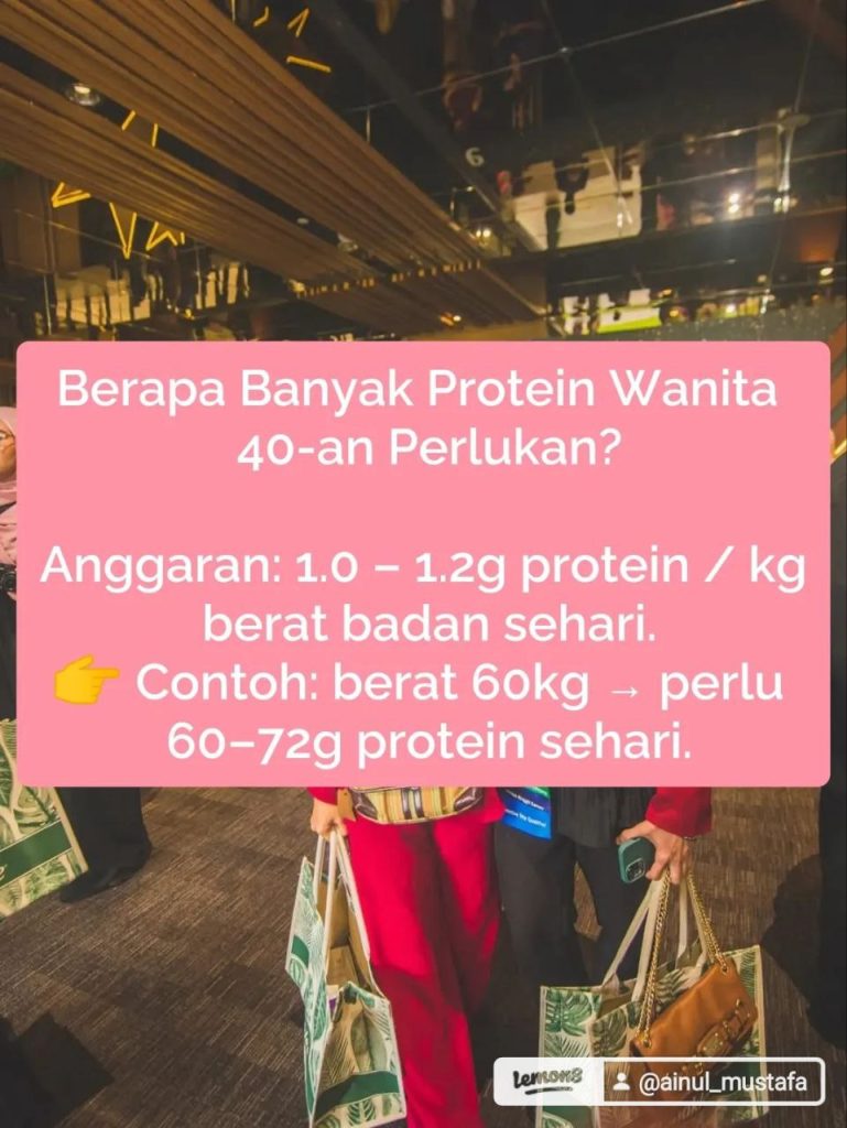 - Wanita 40-an aktif / nak kurus / nak jaga otot: 1.2 – 1.5 g/kg berat badan
