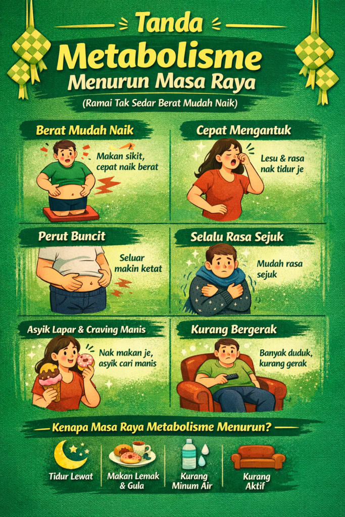 Musim raya memang waktu paling ditunggu-tunggu. Makanan sedap, ziarah keluarga, tidur lewat dan aktiviti santai jadi rutin harian. Namun tanpa sedar, gaya hidup sepanjang raya boleh menyebabkan metabolisme badan menurun. Jom kenali tanda metabolisme menurun masa raya supaya anda boleh bertindak lebih awal.