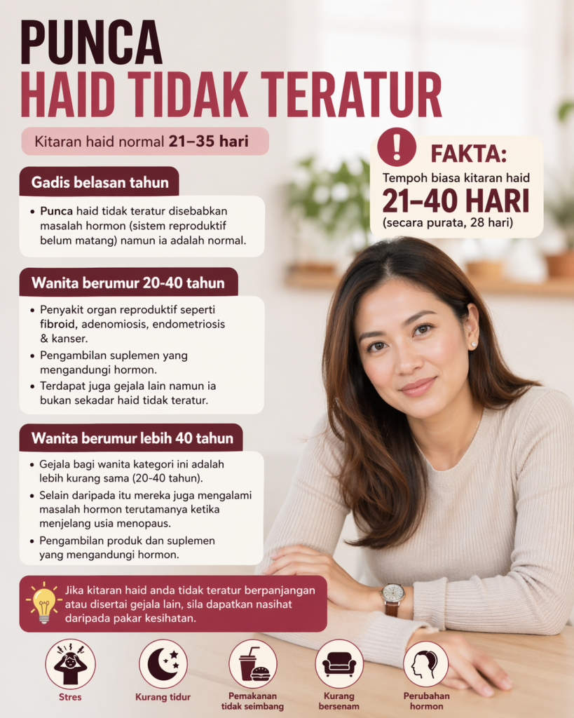 Masuk usia 40-an, ramai wanita mula perasan kitaran haid semakin tidak menentu. Ada yang datang lambat, ada yang datang terlalu kerap, dan ada juga yang tiba-tiba langsung tidak datang untuk beberapa bulan. Keadaan ini sering menimbulkan kerisauan, terutama bila badan mula rasa “lain macam” berbanding dulu.