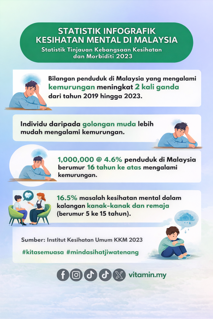- 1,000,000 atau 4.6 % penduduk di Malaysia berumur 16 tahun ke atas mengalami kemurungan